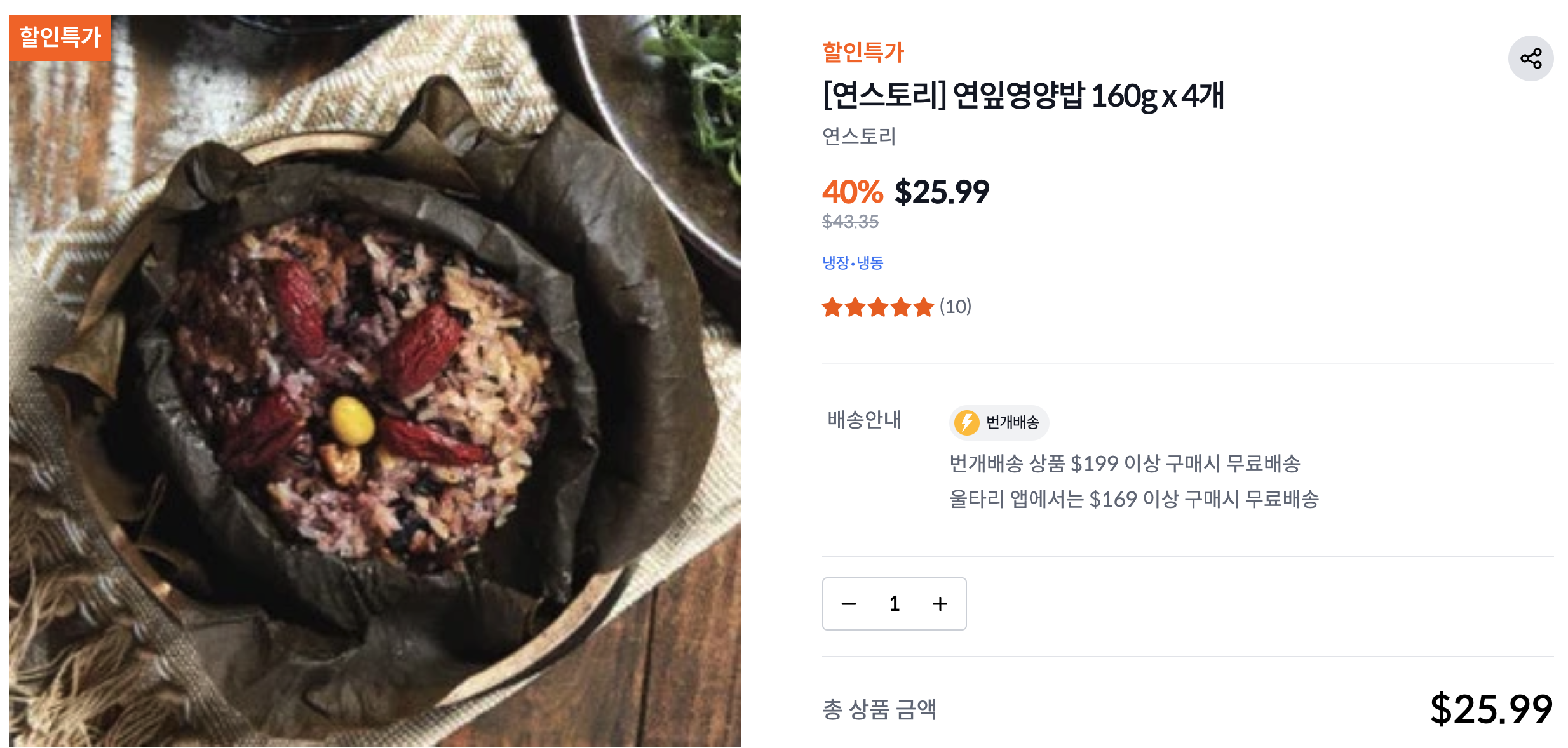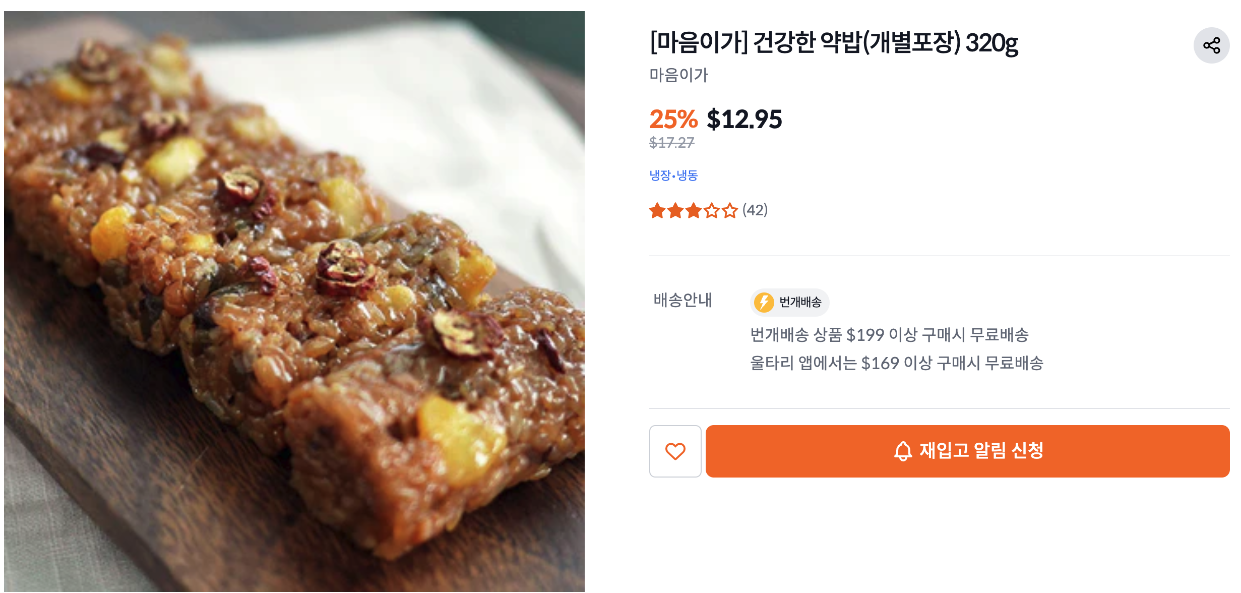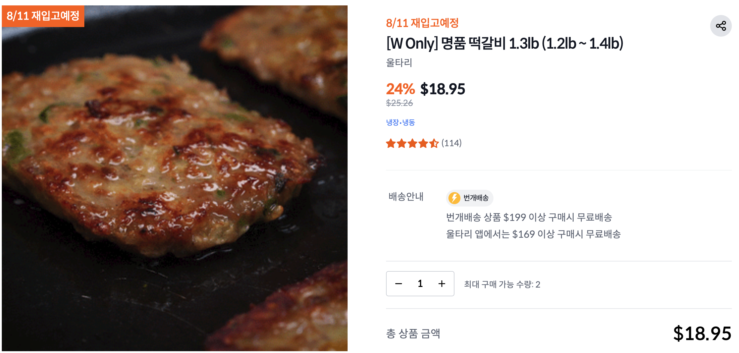 배송 - 일반 제품 $99+ 무료배송, 냉장/냉동제품 $169+ 무료배송 (분리되어있음), 그 외 배송비 $6.95